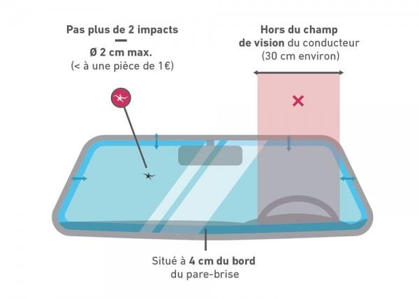 Grâce à son verre feuilleté, votre pare-brise peut être réparé si trois conditions sont remplies: le dommage est moins large qu’une pièce de 1€ (environ) et il se trouve à au moins 4cm du bord et en dehors du champ de vision du conducteur.